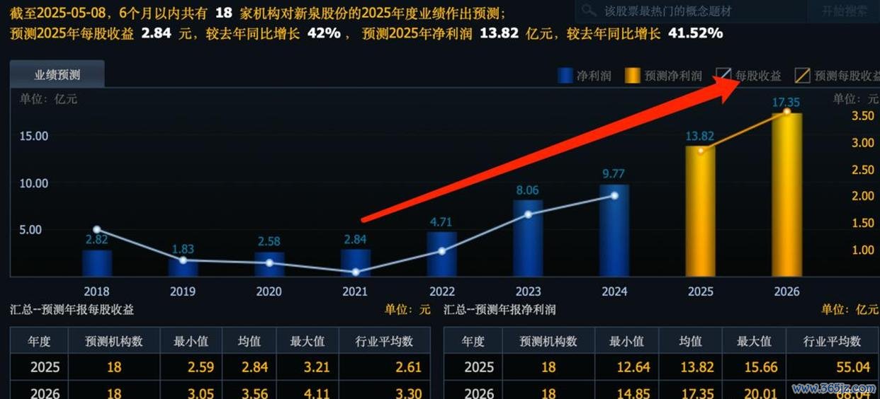 我瞅了一眼,这新泉股份的业绩真挺猛的。2021年的时候,公司净利润才2.84个亿,结果到了2024年,直接飙到9.77亿,三年时间利润翻了三倍还多呢。而且啊,那些机构预测说,到2026年,净利润可能还会涨到17个亿,这利润增长速度简直飞起。要是按照这个预测来算,等于说五年的时间,利润能涨8倍多,这速度也太惊人了吧!