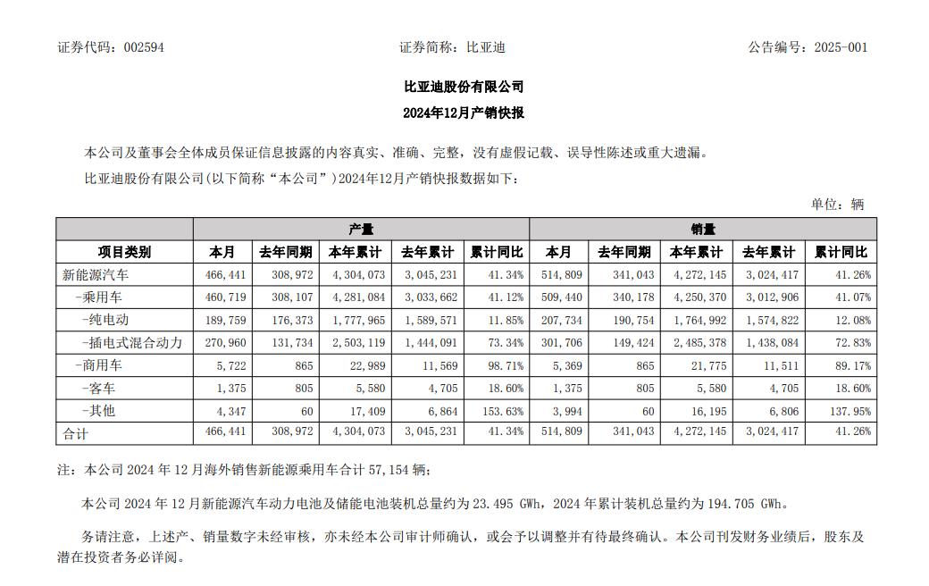 比亚迪公告,2024年12月新能源汽车销量为51.48万辆,去年同期为34.1万辆,本年累计销量为427.21万辆,去年累计为302.44万辆,累计同比增长41.26%。其中,乘用车销量为50.94万辆,去年同期为34.02万辆,本年累计销量为425.04万辆,去年累计为301.29万辆,累计同比增长41.07%。
